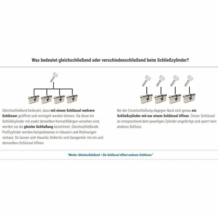 Hinweis: Bei einer Bestellung mehrerer gleichschließender Zylinder der Abus Vitess 1000, werden alle mit der gleichen Schließung versehen. Bei einzelnen Bestellungen sind nur jeweils die Sets in sich gleichschließend. Die individuelle Schließungsnummer ist auf der mitgelieferten Codekarte hinterlegt. Mit dieser individuellen Nummer und Schließung können auch entsprechende gleichschließende Artikel bestellt werden, die jedoch als Sonderanfertigung zu bewerten und anzufragen sind.