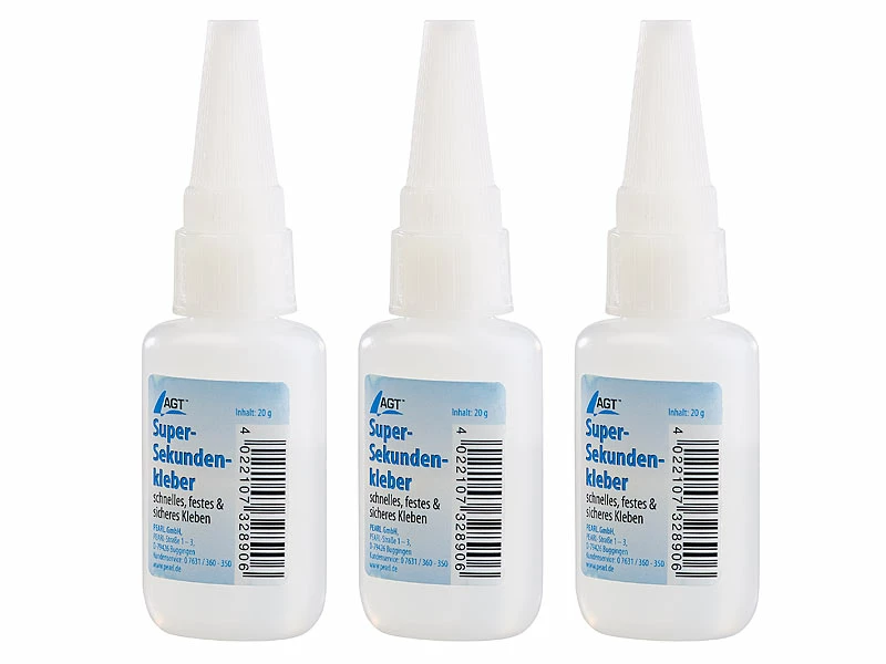 - 3x 20 Gramm jeweils in praktischer Dosierflasche – Kraftkleber – Außerdem relevant oder passend zu: Gel, Blitz, Leder, Gläser, Flasche, Modellbau, reparieren, AGT Kleber, Metallkleber, LED Flaschen, Industriekleber