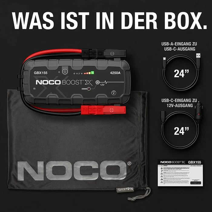 Lieferung: inkl. Starthilfekabel, Batterieklemmen, USB-Kabel von USB-C auf USB-A, verschließbarer Microfaserbeutel