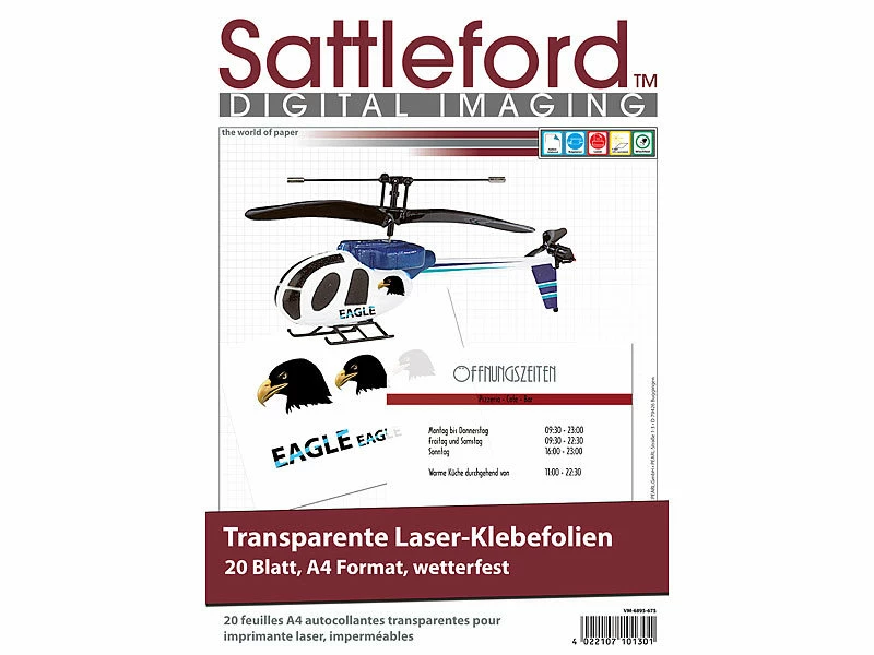 – Bedruckbare Folien – Außerdem relevant oder passend zu: Auto, Möbel, Laser, Decal, Küche, Kleber, Papier, Outdoor, Fotopapier, wetterfest, Druckerpapier, Transferfolie, Selbstklebende, selber drucken, Etikettendrucker, Farblaserdrucker, Transparente Etiketten, (klar) wischfest selbstklebend - EAN: 4022107101301