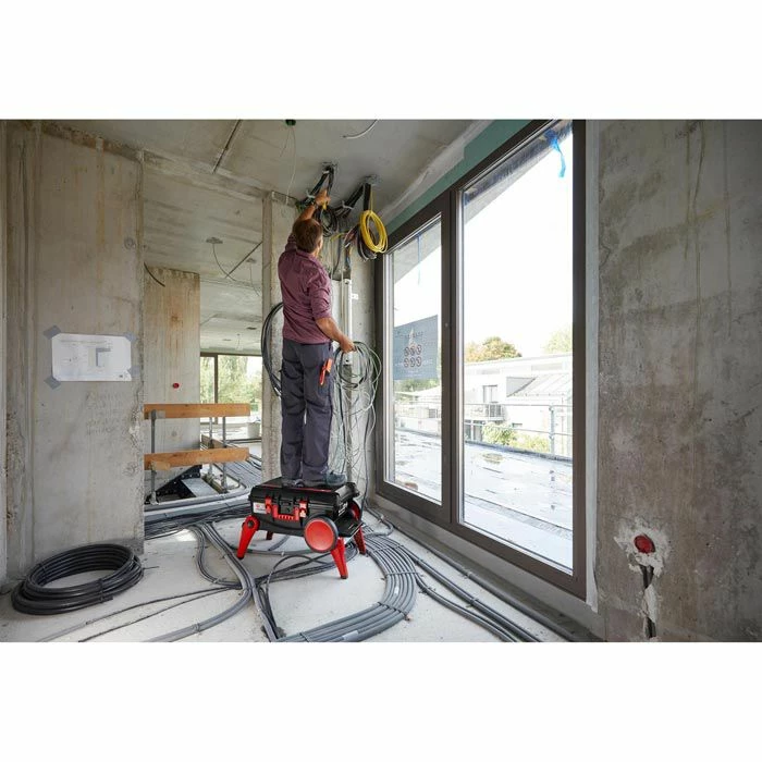 sonstiges: umfangreiches Werkzeugsortiment, Trolley mit großen Rädern und ausklappbaren Beinen für rutschsicheren Tritt, durch die erhöhte Position ist eine komfortable, rückenschonende Entnahme der Werkzeuge möglich, V-förmige Kerbung mit Skala im Kofferdeckel für beispielsweise das Absägen von einem Kabelkanal, zusätzlich mit Gasdruckdämpfern ausgestattet, welche ein versehentliches Zufallen des Deckels verhindern, Platz für Zusatzwerkzeug
