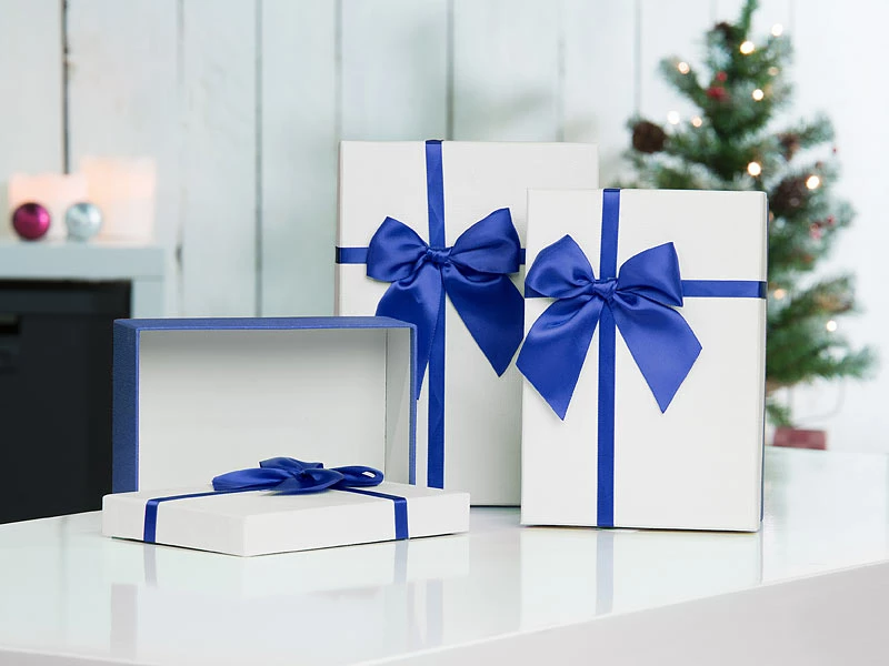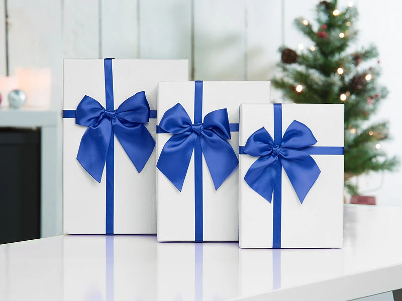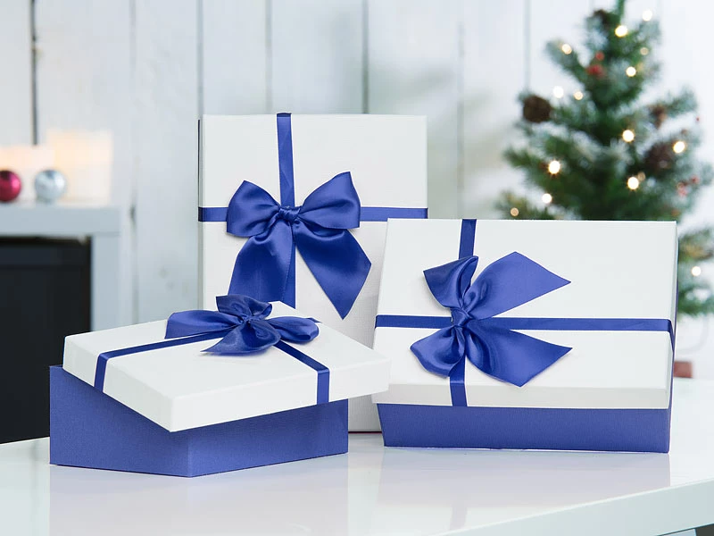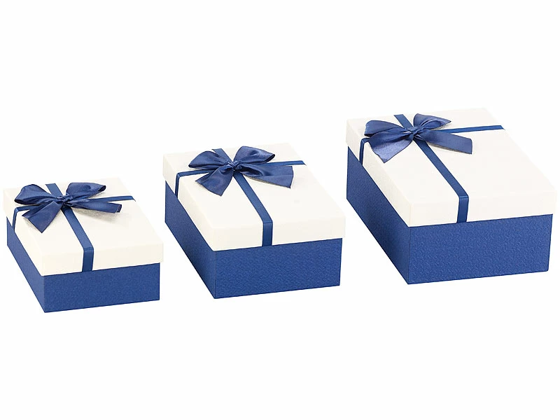 Viel Platz in edler Aufmachung: In 3 verschiedenen Größen bieten die Boxen viel Platz für verschiedenste Geschenke. Auf den cremefarbenen Deckeln setzen hübsche blaue Schleifen einen farblichen Akzent.