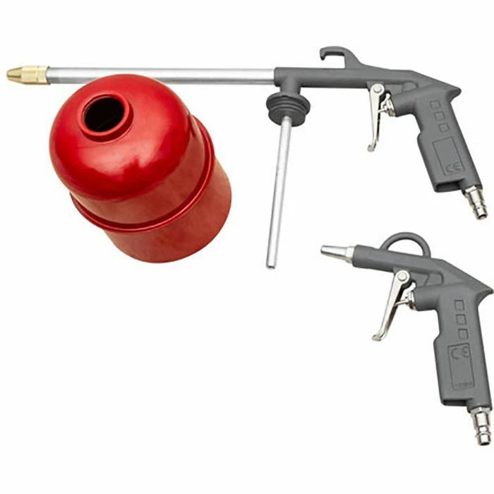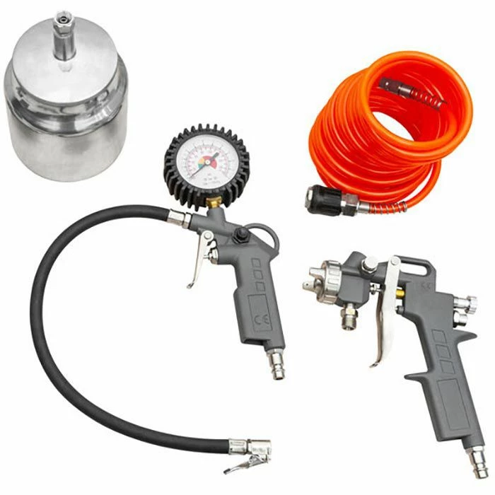 Set bestehend aus: Reifenfüllmessgerät mit Manometer, Sprüh-, Farbspritz- und Druckluftpistole, Spiralschlauch